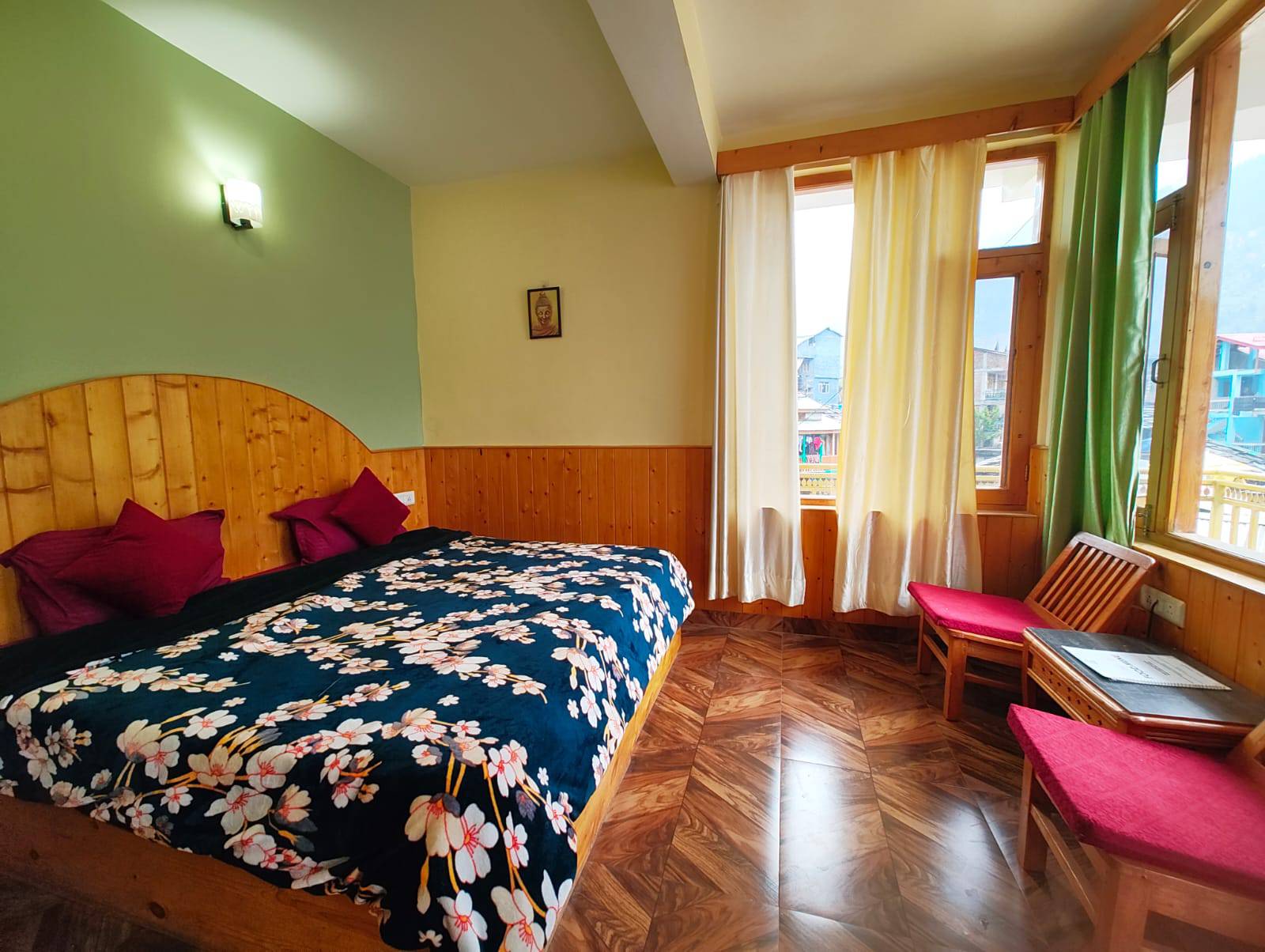 The Deluxe Room is ideal for small families or groups. Featuring a warm wooden interior, it includes a double bed and an additional single bed, ensuring comfort for three guests. With mountain views, attached bathroom, and modern amenities like WiFi and cozy seating, it’s perfect for a peaceful and spacious stay in Old Manali.